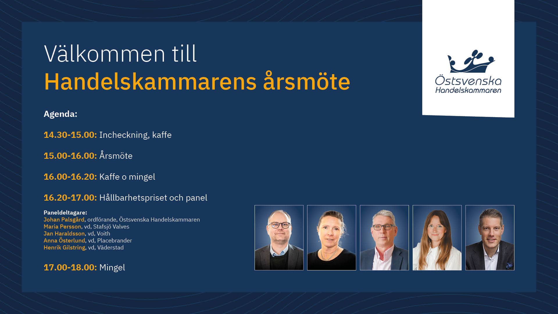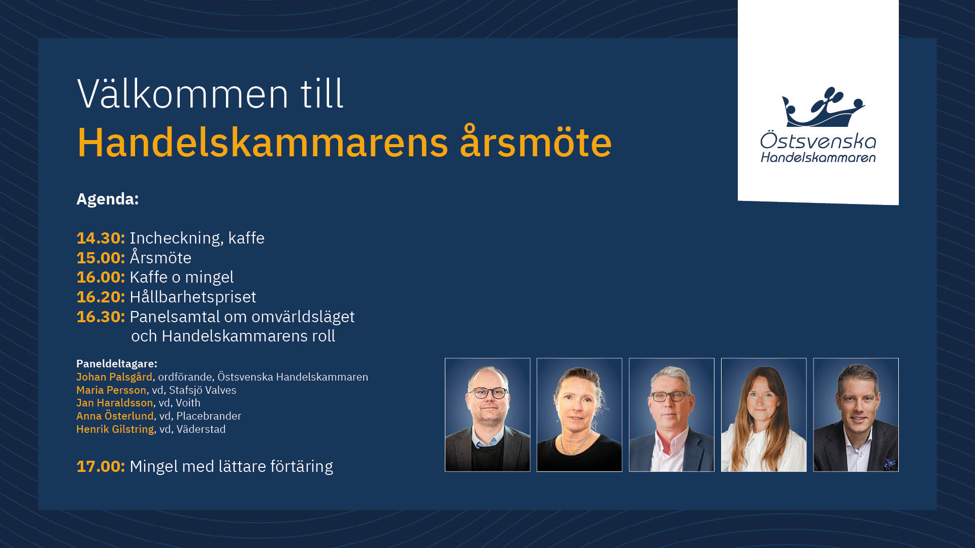 Varmt välkommen till Östsvenska Handelskammarens årsmöte. Vi inleder med sedvanlig stämma och fortsätter med föredrag och mingel.