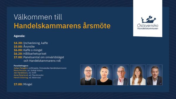 Varmt välkommen till Östsvenska Handelskammarens årsmöte. Vi inleder med sedvanlig stämma och fortsätter med föredrag...
